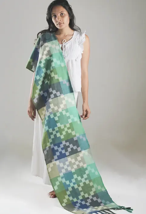 This single-ikat (warp) stole was hand-dyed and hand-woven on a dobby loom. The project helped in understanding the labor-intensiveness, level of precision and challenges of making ikat fabric and was a precursor to the Graduation Project Collection.