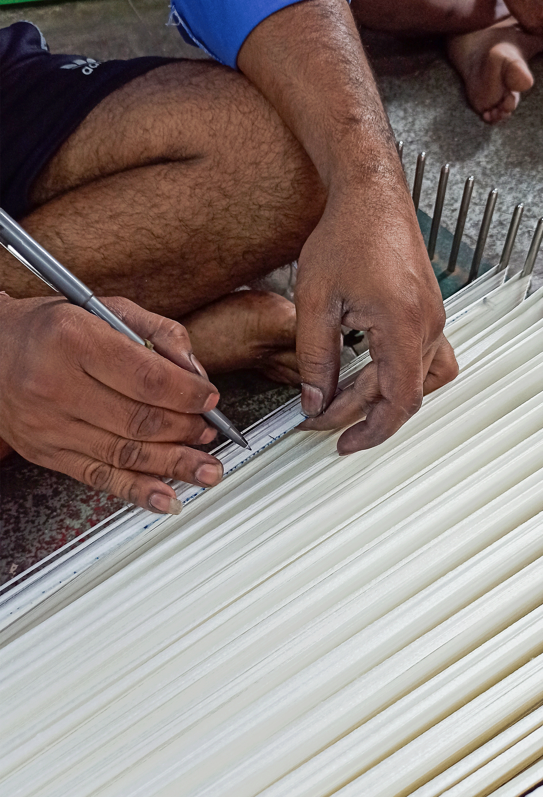 The project focuses on re-imagining the vocabulary of traditional Pochampalli lkats through a collection of contemporary sarees. The primary objective is to create a visually disruptive design language that encourages patronage towards the craft, thus providing consistent employment and financial stability to the artisans of Pochampalli.